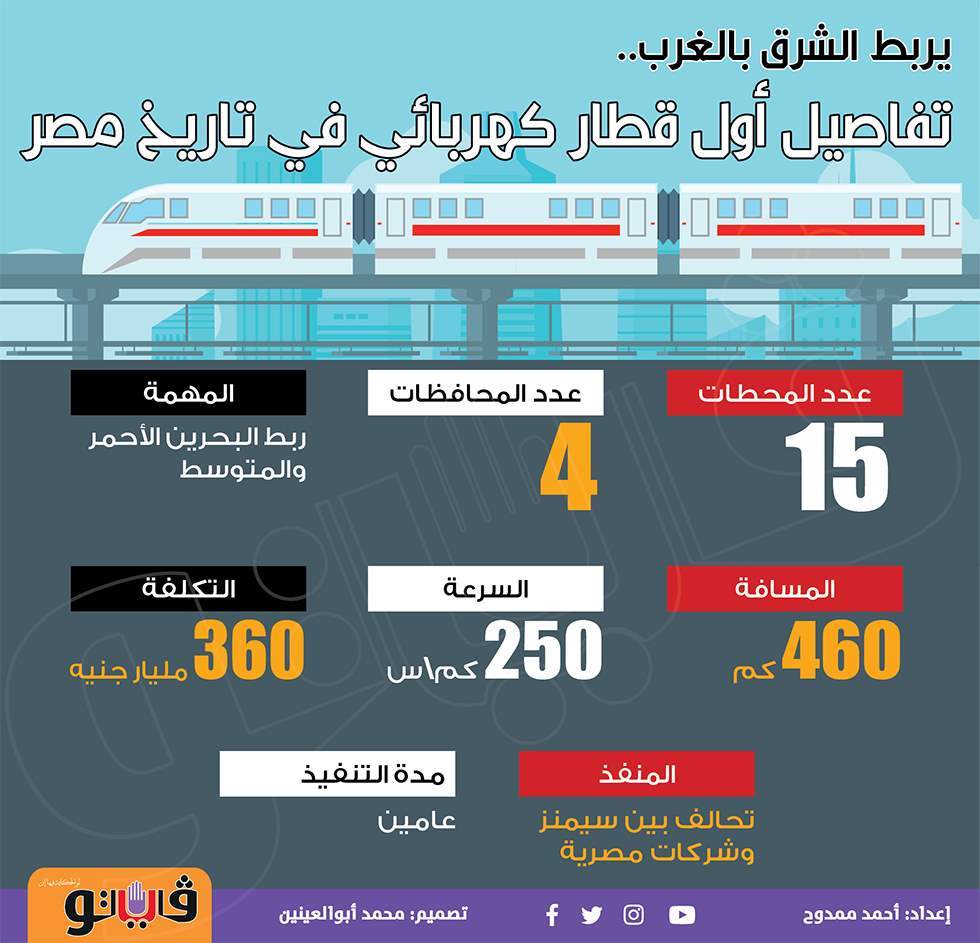 يربط الشرق بالغرب.. تفاصيل أول قطار كهربائي في تاريخ مصر| إنفوجراف الجمعة 15/يناير/2021 - 10:22 م 1/15/2021 10:22:06 PM قطار كهربائي أحمد ممدوح شارك طباعة 18 حجم الخط شارك طباعة القطار الكهربائي سيمنز سيمنز الالمانية السخنة العلمين قطار السخنة العلمين
