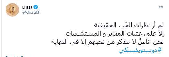 اثارت الفنانة اللبنانية إليسا الجدل باقتباسها لمقولة الأديب العالمي فيودور دوستويفسكي عن نظرات الحب الحقيقية التي لا توجد إلا على عتبات المقابر والمستشفيات، الأمر الذي دفع متابعيها للتفاعل معها وإبداء محبتهم لها في الصحة قبل المرض.