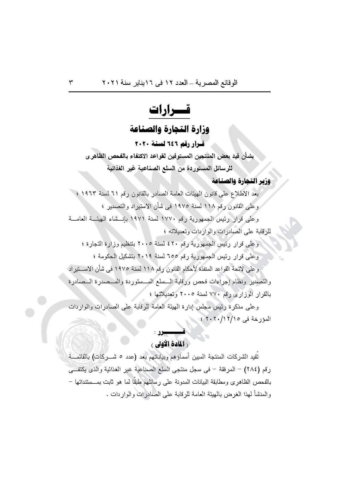 نشرت جريدة الوقائع المصرية في عددها رقم 12، الصادر في 16يناير 2021، قرار وزارة التجارة والصناعة رقم 646 لسنة 2020، بشأن قيد بعض المنتجين المستوفين لقواعد الاكتفاء بالفحص الظاهري للرسائل المستوردة من السلع الصناعية غير الغذائية.