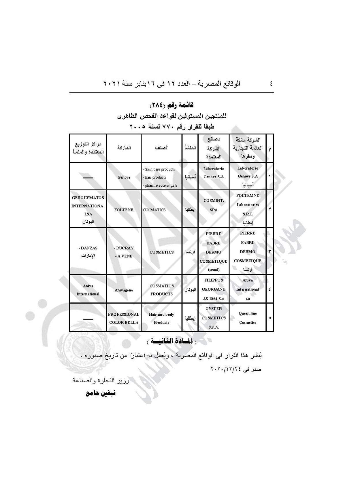 وينص القرار على تقييد 5 شركات باقائمة رقم 284 في سجل منتجي السلع الصناعية غير الغذائية والذي يكتفي بالفحص الظاهري ومطابقة البيانات المدنة على رسائلهم طبقًا لما هو ثابت بمستنداتها والمنشأ لهذا الغرض بالهيئة العامة للرقابة على الصادرات والواردات.