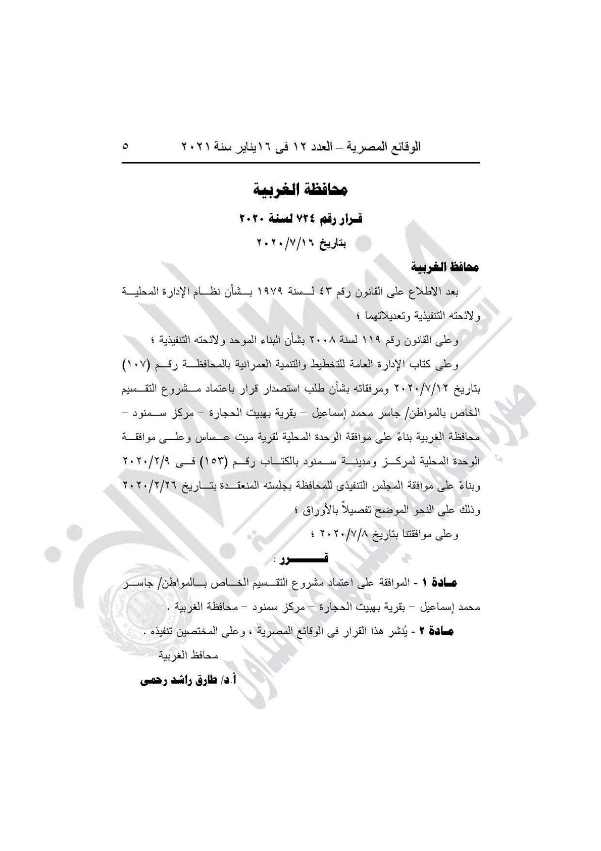 وينص القرار على الموافقة على اعتماد مشروع التقسيم الخاص بالمواطن جاسر محمد إسماعيل بقرية بهبيت الحجارة مركز سمنود محافظة الغربية.