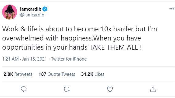 وكتبت كاردي بي عبر حسابها الشخصي على موقع التغريدات القصيرة "تويتر" : "العمل والحياة سيكونان أصعب بعشرة أضعاف، ولكن السعادة تغمرني... فعندما تكون الفرص بين يديك خذها كلها".