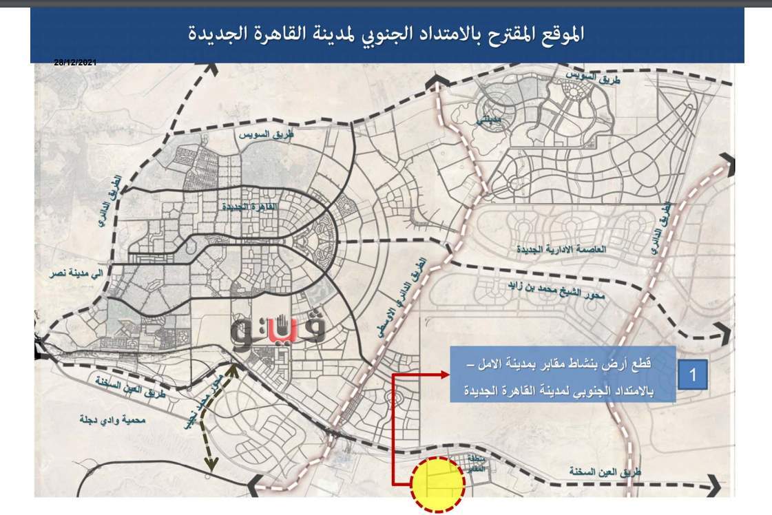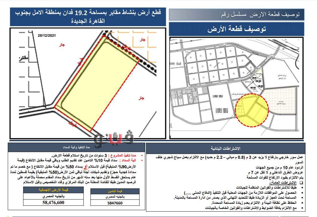 وتطرح بمدينة القاهرة الجديدة أرضا مقابر بمساحة 19.2 فدان بقيمة 58 مليون جنيه بنظام حق انتفاع.