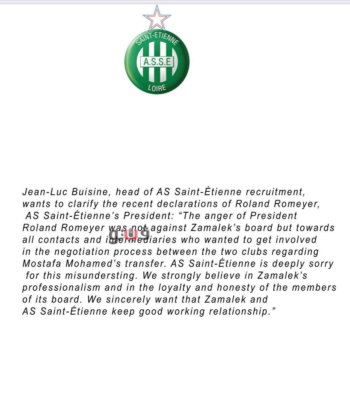 غضب رئيس النادي لم يكن ضد مسئولي الزمالك ولكنه كان موجها ضد الوسطاء الذين حاولوا التدخل في المفاوضات بين الناديين بشأن اللاعب مصطفى محمد، ويأسف نادي سانت إيتيان بشدة لسوء الفهم الذي وقع، ونحن نؤمن بشدة في احترافية وولاء وأمانة مسئولي إدارة نادي الزمالك، ونأمل في استمرار التعاون بين الناديين.