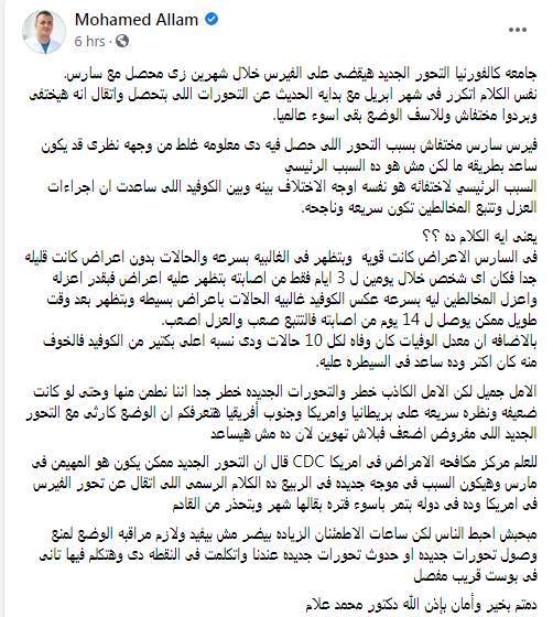 وقال علام في تدوينة له على الفيس بوك: "جامعة كالفورنيا التحور الجديد هيقضى على الفيرس خلال شهرين زى محصل مع سارس".