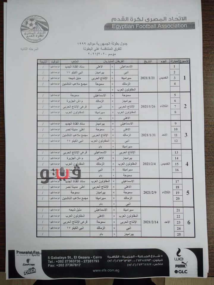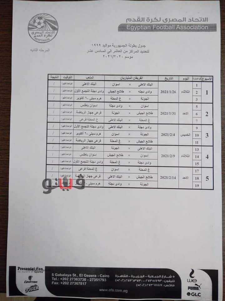 تنشر "فيتو" جدول مباريات التصفية النهائية لمسابقة دوري الجمهورية للشباب لكرة القدم مواليد 1999، بعد إجراء قرعة المسابقة اليوم الأحد بمقر اتحاد الكرة.