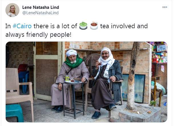 وكتبت السفيرة لينا ناتاشا تغريدة على تويتر "في القاهرة.. هناك العديد من مشاركة تناول القهوة والشاي والشعب ودود دائمًا".
