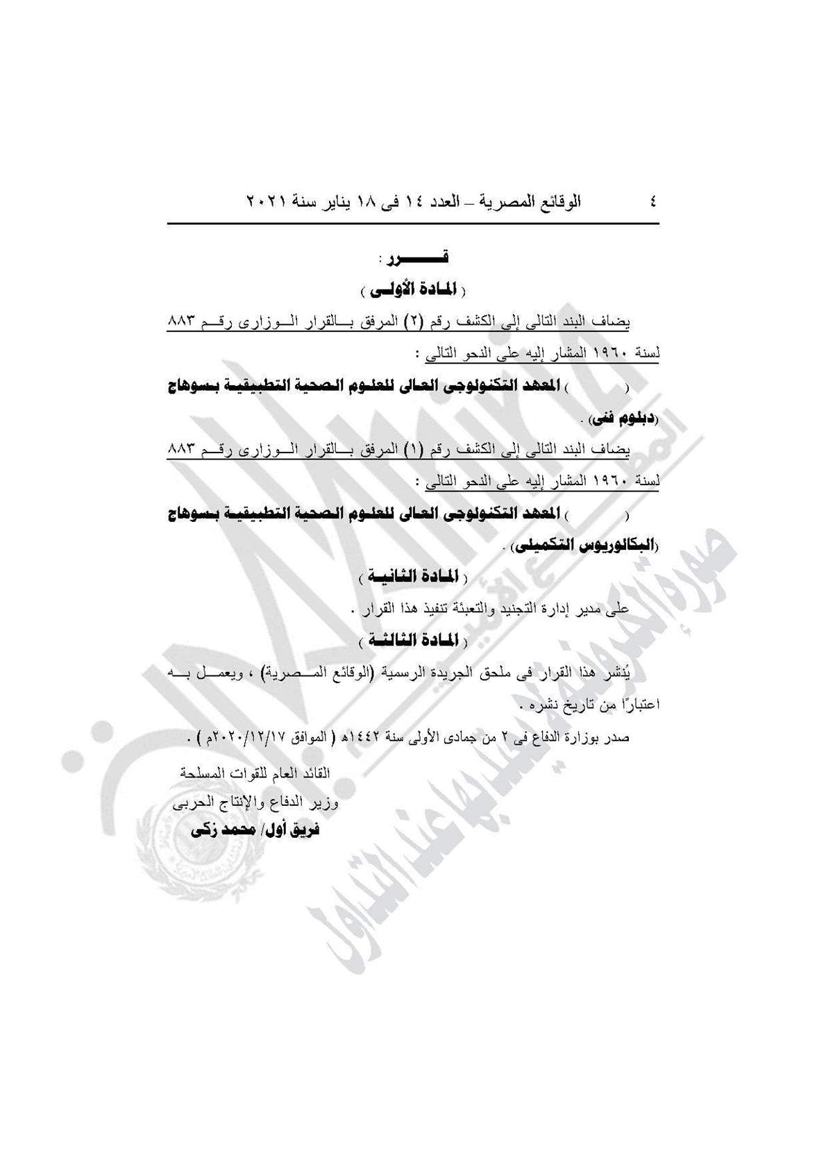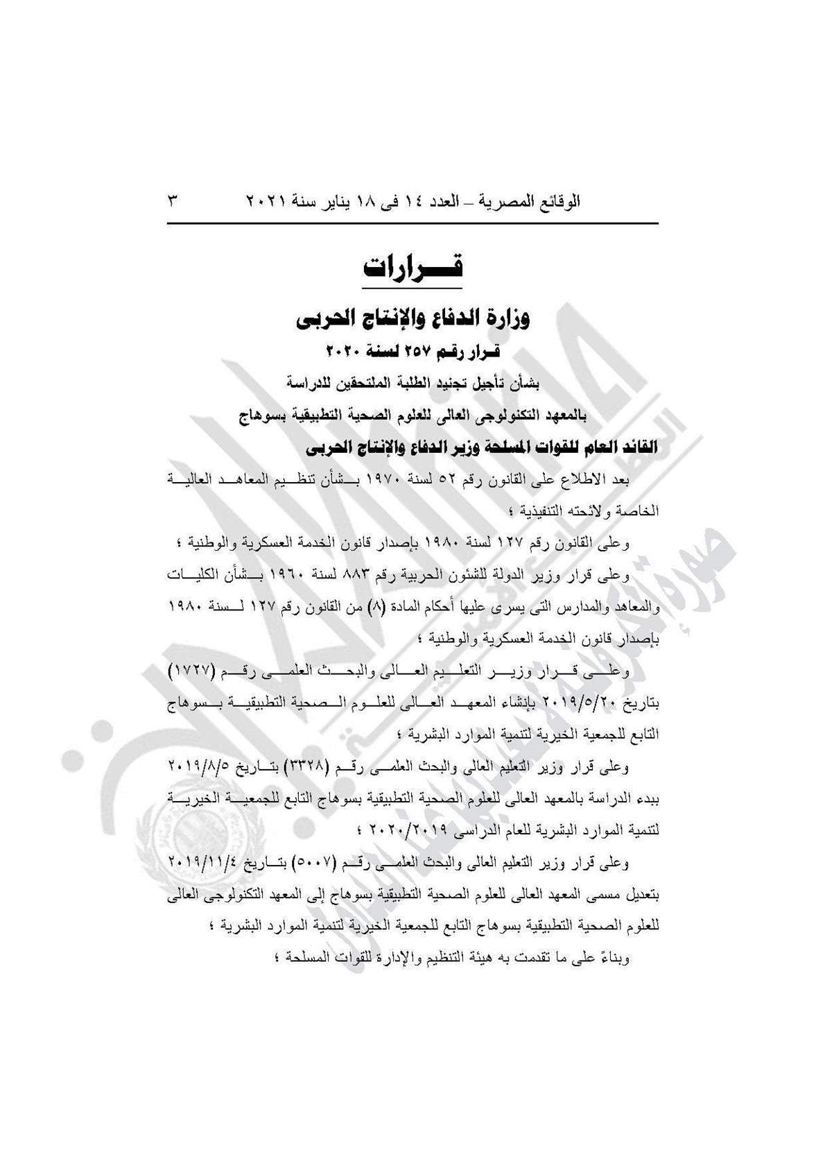 نشرت جريدة الوقائع المصرية في عددها رقم 14، الصادر في 18 يناير 2021، قرار وزارة الدفاع والإنتاج الحربي رقم 257 لسنة 2020، بشأن تأجيل تجنيد الطلبة الملتحقين للدراسة بالمعهد التكنولوجي العالي للعلوم الصحية والتطبيقية بسوهاج.