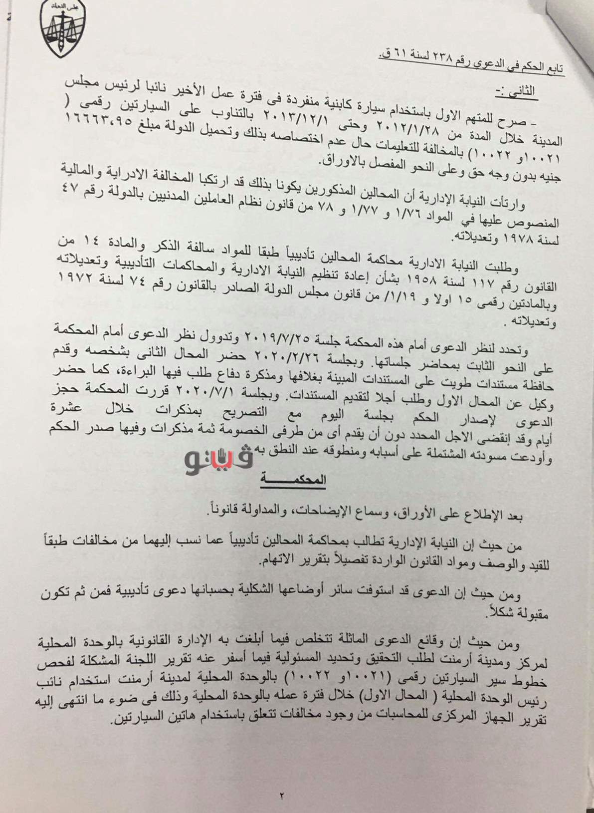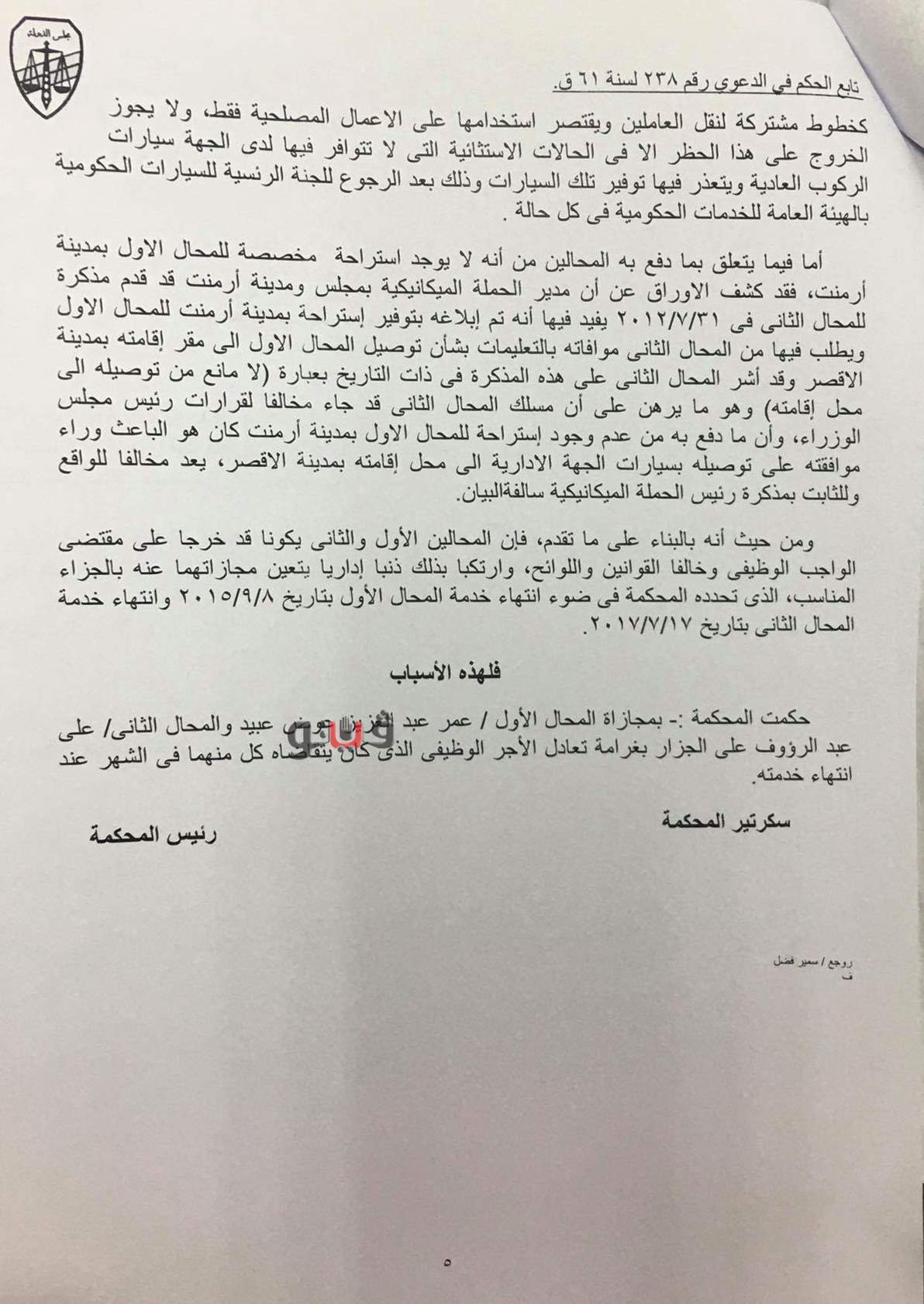وكشفت المحكمة في أسباب حكمها أن عمرعبد العزيز عوض، نائب رئيس الوحدة المحلية لمركز ومدينة أرمنت إستخدم سيارتين في نقله من محل إقامته بمدينة الأقصر إلى جهة عمله بأرمنت والعكس بالمخالفة لتعليمات الهيئة العامة للخدمات الحكومية وقراري رئيس الوزراء رقمي 1025 لسنة 2011 و800 لسنة 2012 مما ترتب عليه تكليف موازنة الدولة مبالغ مالية دون وجه حق.