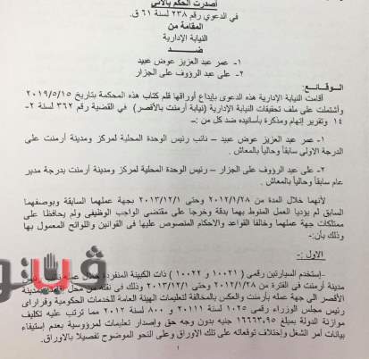 وأصدرت المحكمة حكمها بحضور المستشار فوزي عبد الهادي، ممثل النيابة الإدارية بمجازاة المحال الأول عمرعبد العزيز عوض، نائب رئيس الوحدة المحلية لمركز ومدينة أرمنت والمحال الثاني علي عبد الرؤوف الجزار، رئيس الوحدة المحلية بغرامة تعادل الأجر الوظيفي الذي كان يتقاضاه كل منهم في الشهر عند انتهاء خدمته.
