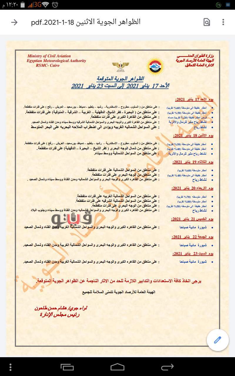 ومن المتوقع سقوط أمطار خفيفة على القاهرة الكبرى على فترات متوقعة وأمطار خفيفة إلى متوسطة على بعض مناطق الوجه البحرى و أمطار متوسطة إلى غزيرة " السلوم، مطروح، الاسكندرية، بلطيم ، رشيد، ،دمياط، بورسعيد،العريش، رفح" ونشاط للرياح المثيرة للرمال والأتربة على السواحل الشمالية ووسط سيناء.