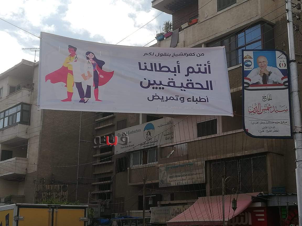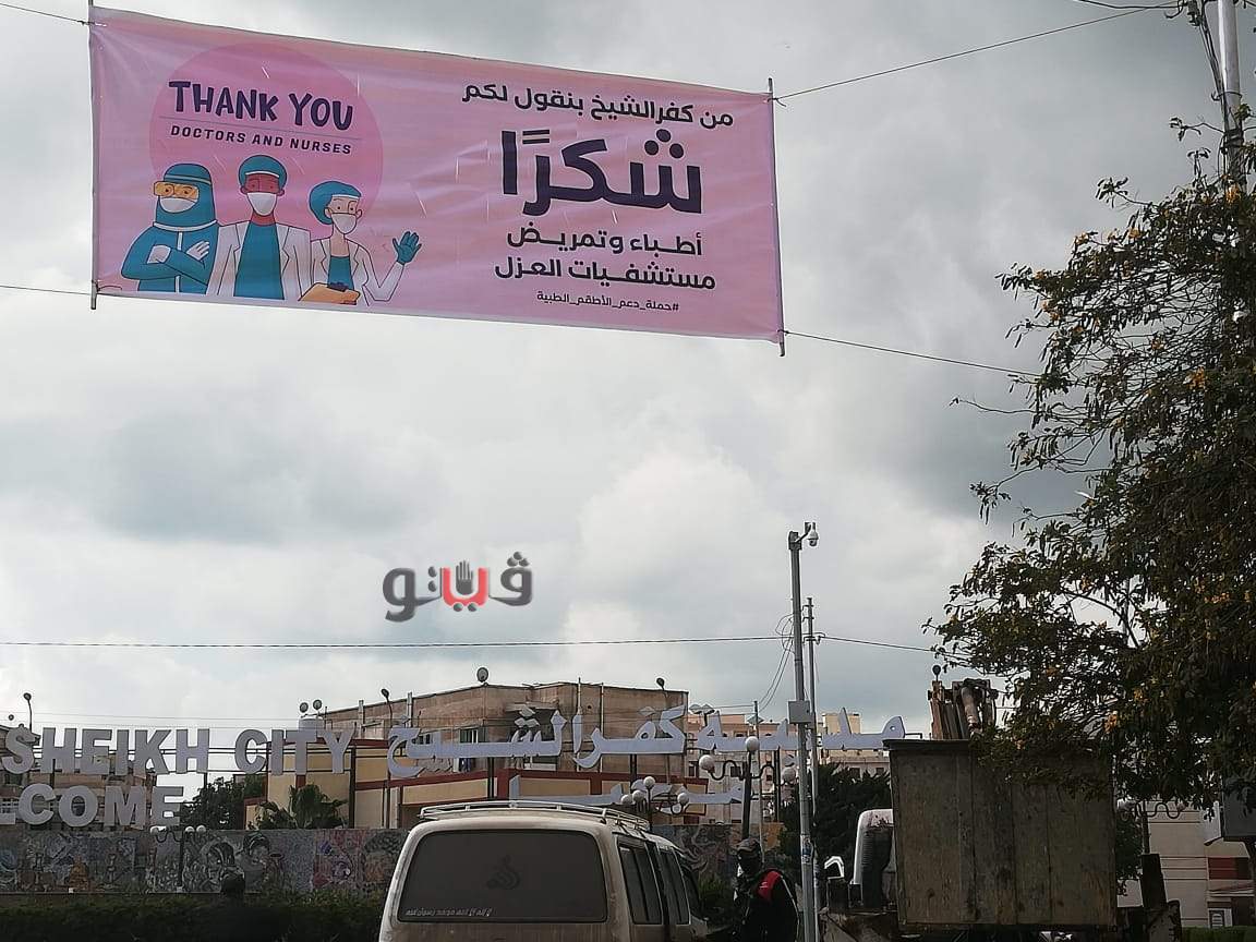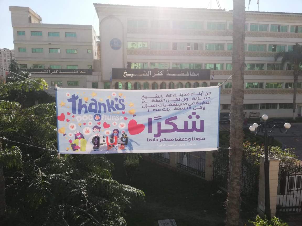 انتشرت لافتات في شوارع مدينة كفر الشيخ، وأمام مبنى المحافظة، حملت كلمات الشكر والتقدير للأطباء والممرضين في كل مستشفيات العزل بجميع المحافظات وبالمستشفيات العامة والمركزية، على مجهوداتهم لمكافحة وباء كورونا.