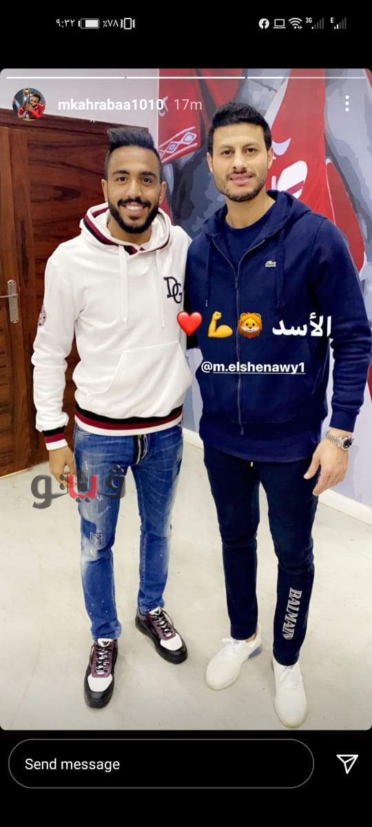 الصورة التى نشرها كهربا على حسابه بموقع الصور إنستجرام، تجمعه مع محمد الشناوي، وعلق عليها كهربا بكلمة "الأسد" فى إشارة محمد الشناوي حارس مصر الأول والنادي الأهلي .