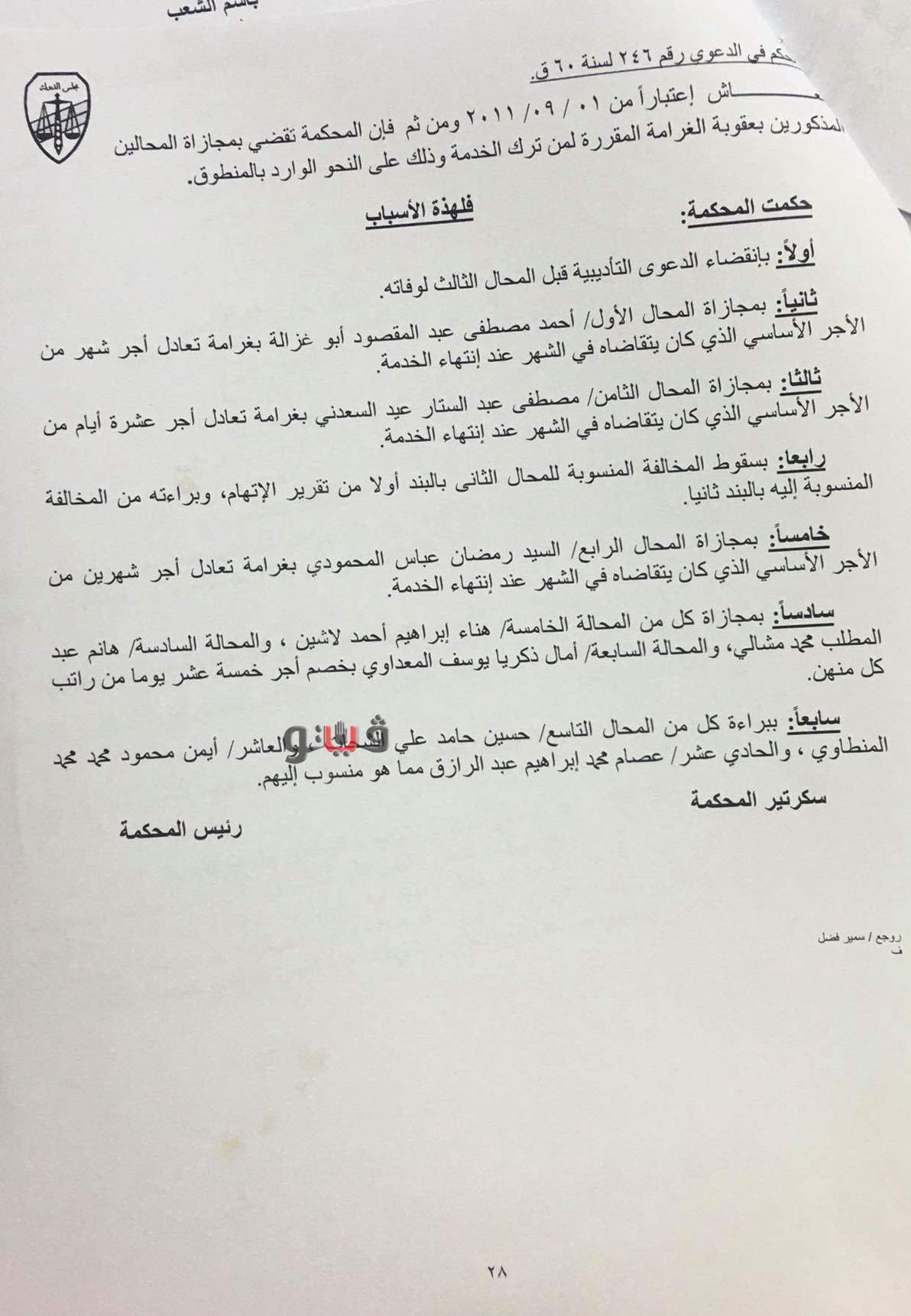 وقضت المحكمة بخصم أجر 15 يوما من راتب هناء إبراهيم أحمد لاشين، مديرة الحسابات لإهمالها في الإشراف علي أعمال مراجع الحسابات ورئيس المراجعة مما أدى الى استخراج الشيكات وصرفها دون إستيفاء الأوراق بالمخالفة للائحة المالية، كما أهملت في الإشراف علي أعمال إدارة الحسابات