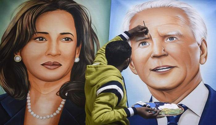 وبحسب وكالة الأنباء الفرنسية، فإن الرسام الهندي وضع لمساته الأخيرة اليوم الثلاثاء على لوحة تصور الرئيس الأمريكي المنتخب جو بايدن (يمين) ونائبته كامالا هاريس (يسار) في أمريتسار.