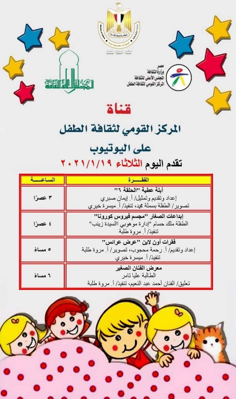 وننشر قائمة العروض والفعاليات المقرر إقامتها "أون لاين" اليوم الثلاثاء الموافق19 يناير 2021، وأبرزها لقاء جديد ببرنامج إبداعات الصغار ومعرض الفنان الصغير: