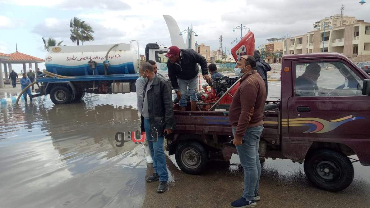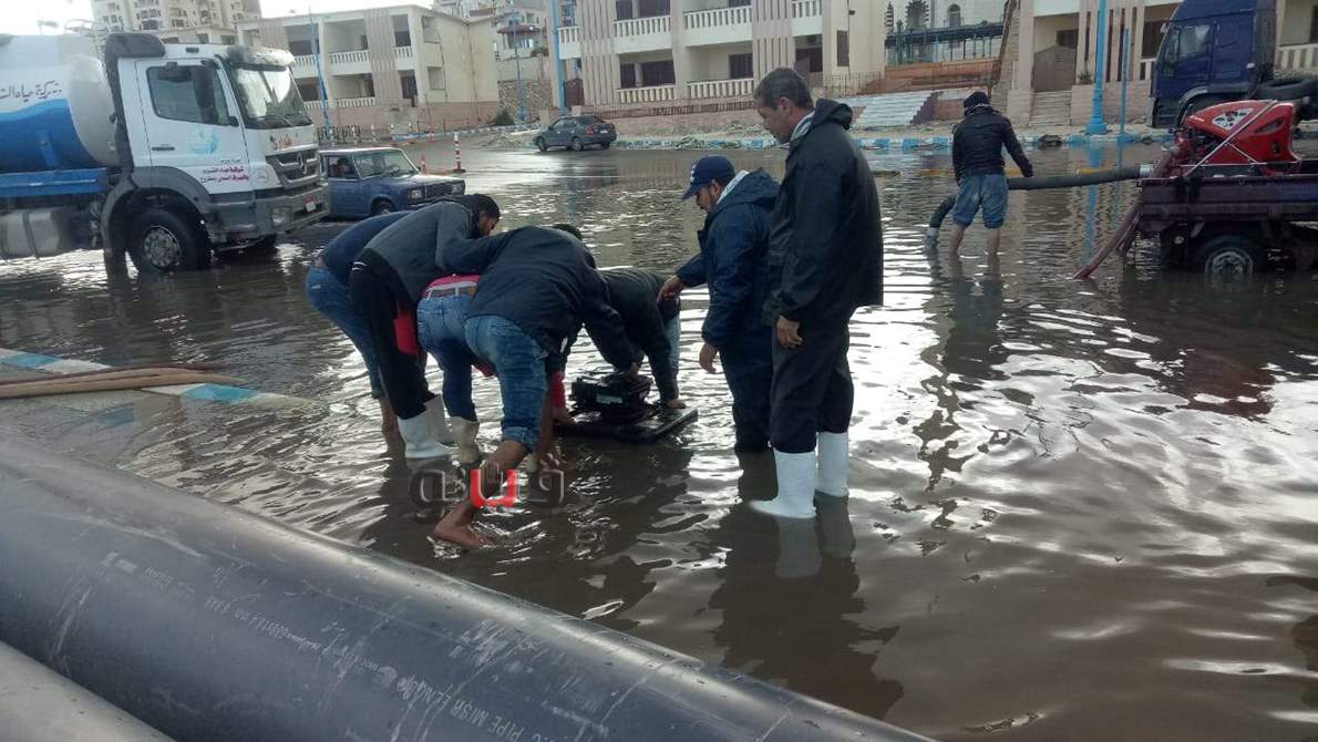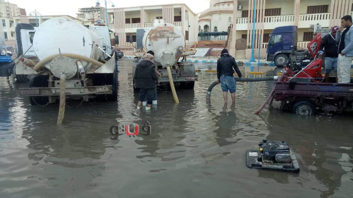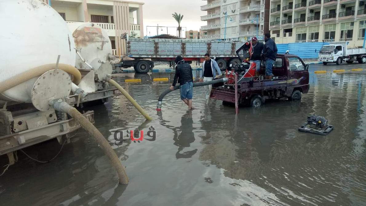 معدات وسيارات كسح المياه تنتشر في شوارع مطروح لرفع مياه الأمطار | صور