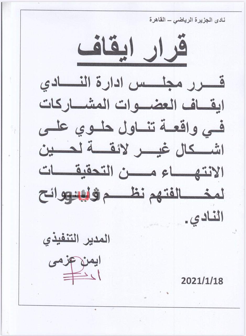 قرر نادي الجزيرة ، إيقاف العضوات المشاركات في واقعة تناول حفل "حلوى الأعضاء التناسلية" لحين الانتهاء من التحقيقات لمخالفتهم نظم ولوائح النادي.
