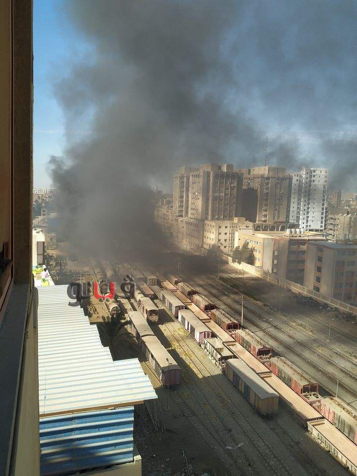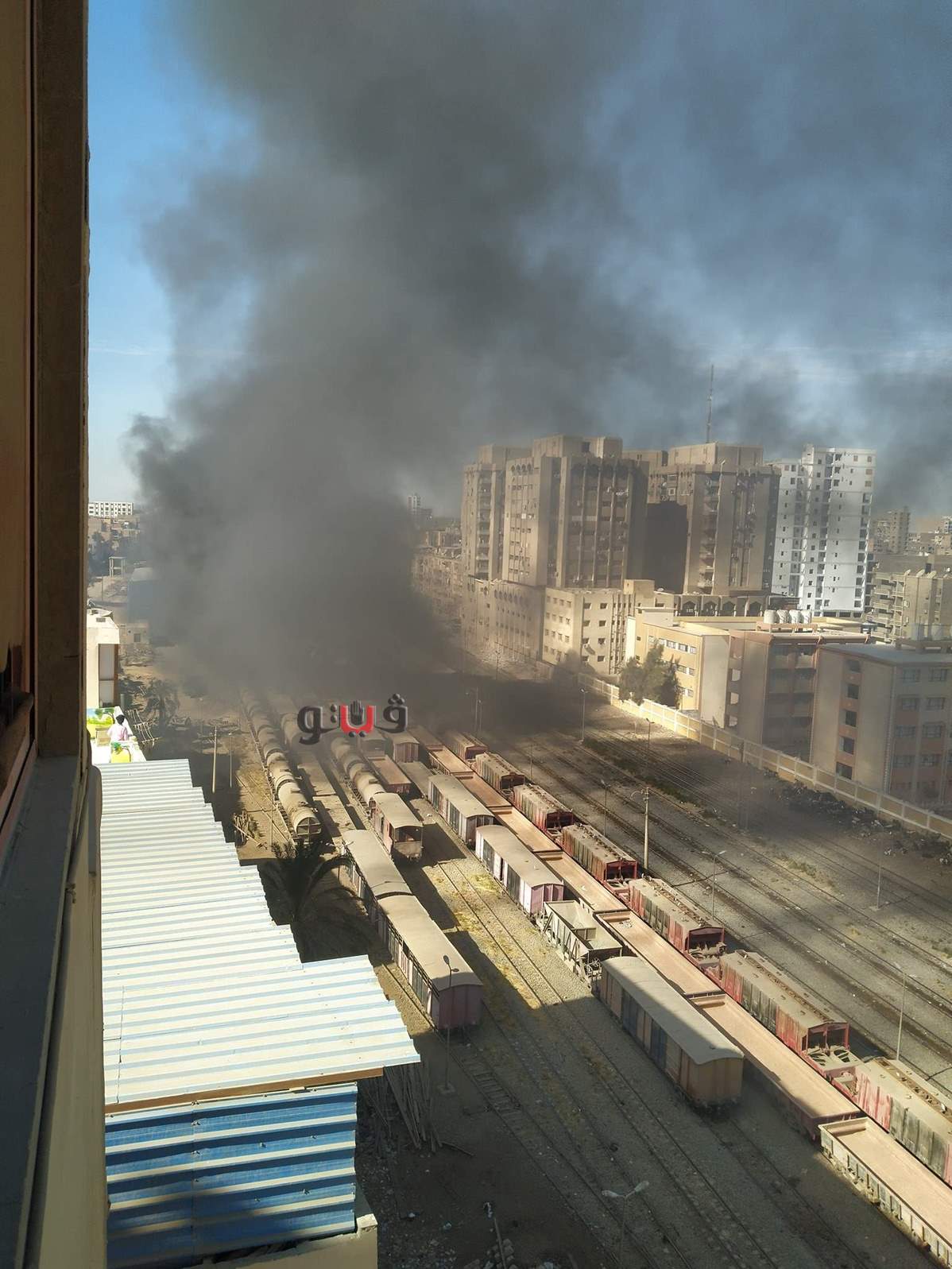 نشب منذ قليل حريق بأحد قطارات البضائع بمنطقة السكة الحديد بحوض الثلاثين سيالة