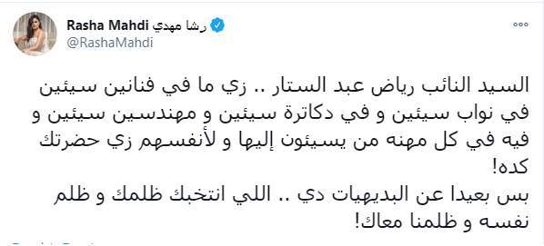 وكتبت رشا مهدي تغريدة على تويتر قالت فيها:" السيد النائب رياض عبد الستار.. زي ما في فنانين سيئين فيه نواب سيئين و في دكاترة سيئين ومهندسين سيئين و فيه في كل مهنة من يسيئون إليها و لأنفسهم زي حضرتك كده!"