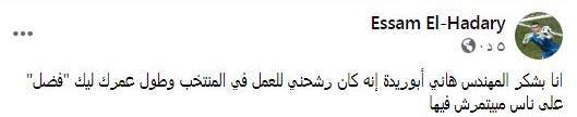 وكتب عصام الحضري :" أنا بشكر المهندس هاني أبوريدة إنه كان رشحني للعمل في المنتخب وطول عمرك ليك "فضل" على ناس مبيتمرش فيها".