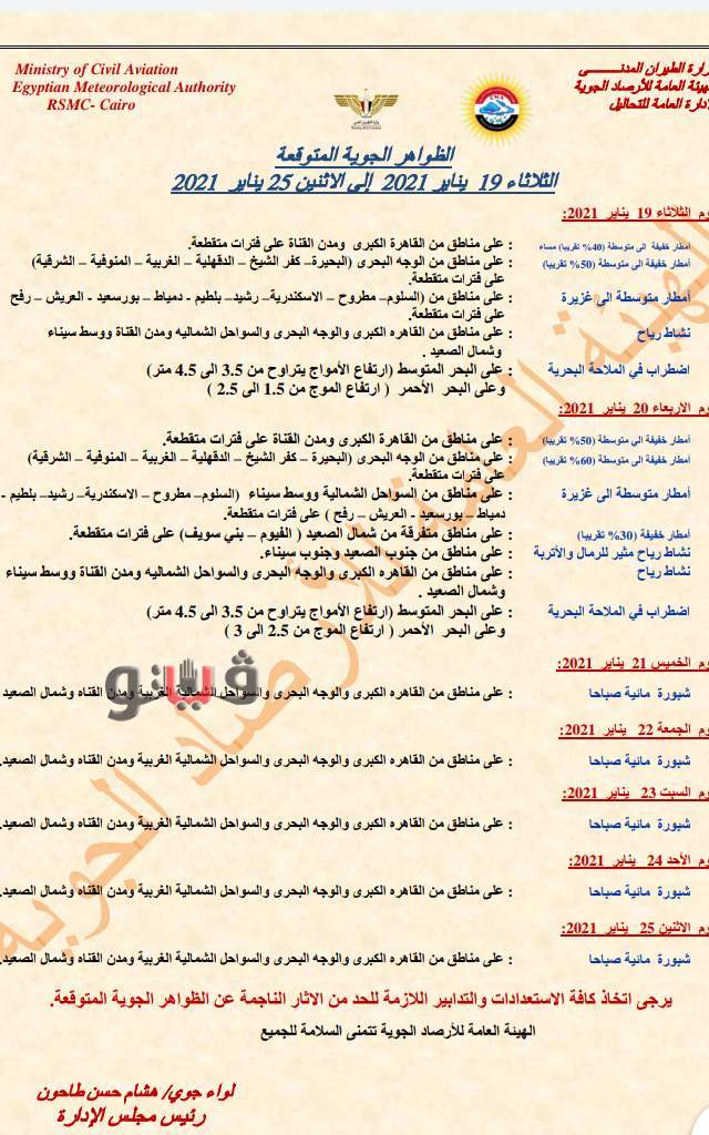 كما سيسود طقس، شديد البرودة ليلا، على القاهرة والوجه البحرى، وعلى السواحل الشمالية، وبارد على جنوب سيناء، وشديد البرودة على جنوب سيناء وجنوب الصعيد.