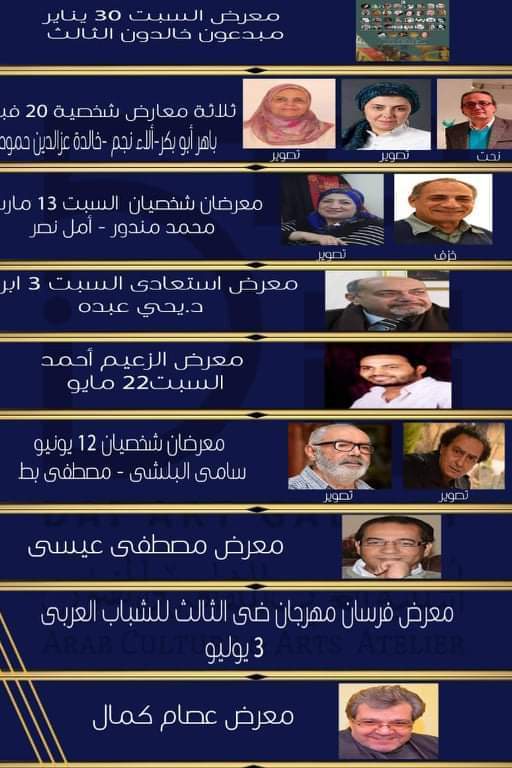 حدد أتيليه العرب للثقافة والفنون "جاليري ضي"، مواعيد عدد من المعارض لكبار الفنانين التشكيليين، والتى ينظمها بمقره بمنطقة المهندسين خلال الستة أشهر المقبلة.