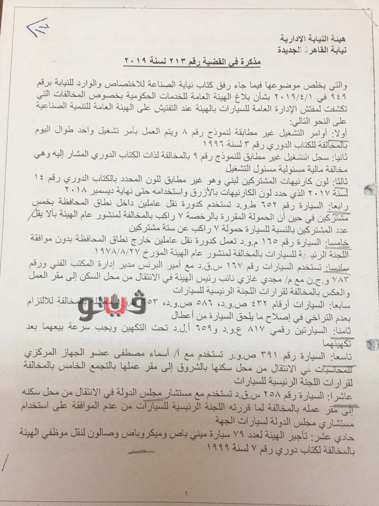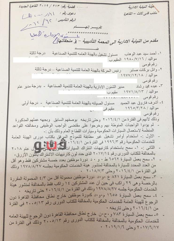 وقد رصد تقرير قضائي صادر عن النيابة الإدارية تفاصيل قضية فساد مالي وإداري داخل الهيئة العامة للتنمية الصناعية أحيل على إثرها 4 مسئولين للمحاكمة العاجلة بعد ثبوت إرتكابهم مخالفات جسيمة في تخصيص السيارات التابعة لجهة عملهم لبعض المستشارين بالمخالفة لضوابط إستخدام السيارات الحكومية.