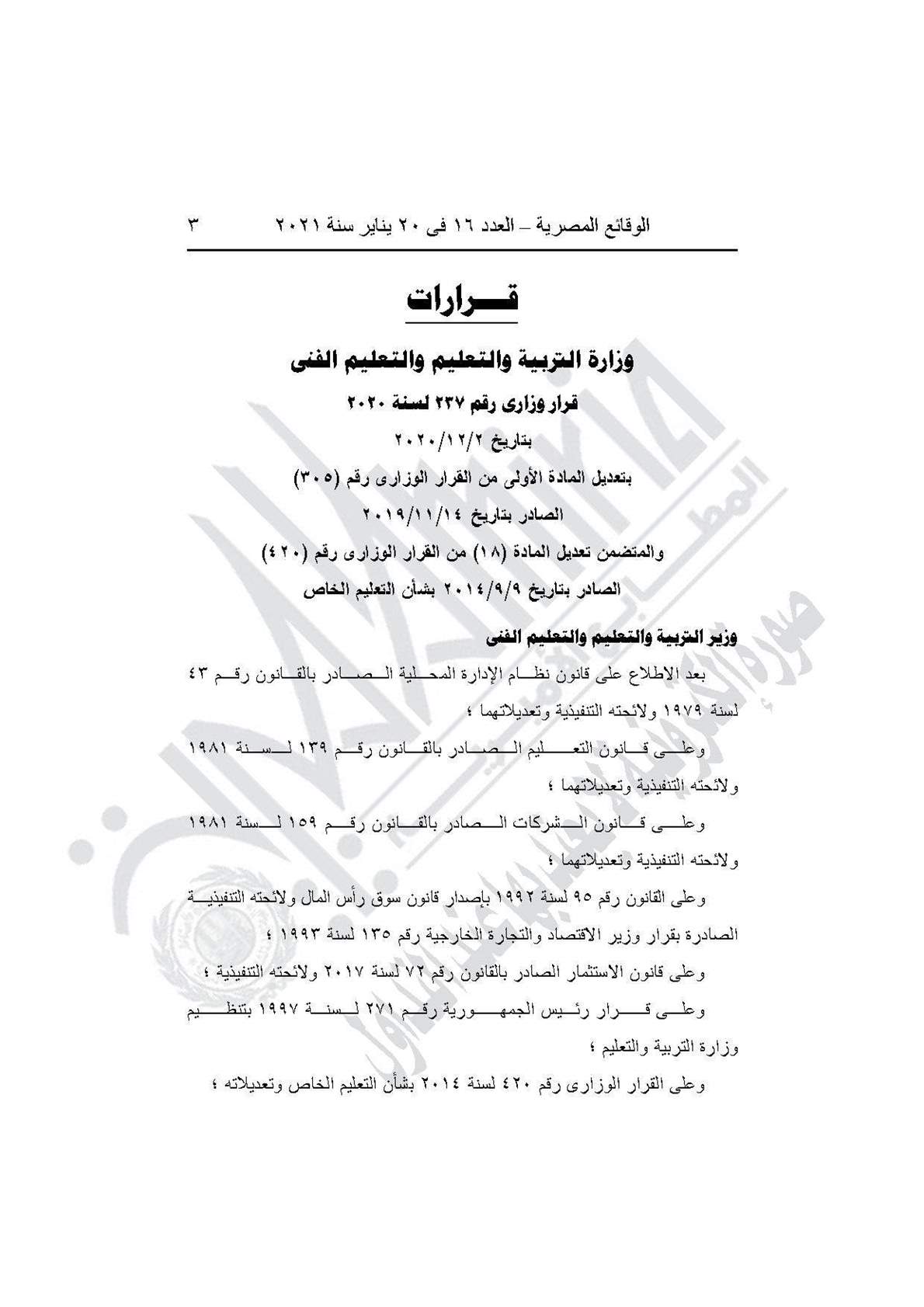 القرار رقم 237 لسنة 2020، بتعديل المادة الأولى من القرار الوزاري رقم 305 الصادر بتاريخ 14/11/2019، والمتضمن تعديل المادة 18 من القرار الوزاري رقم 420 الصادر بتاريخ 9/9/2014 بشأن التعليم الخاص.