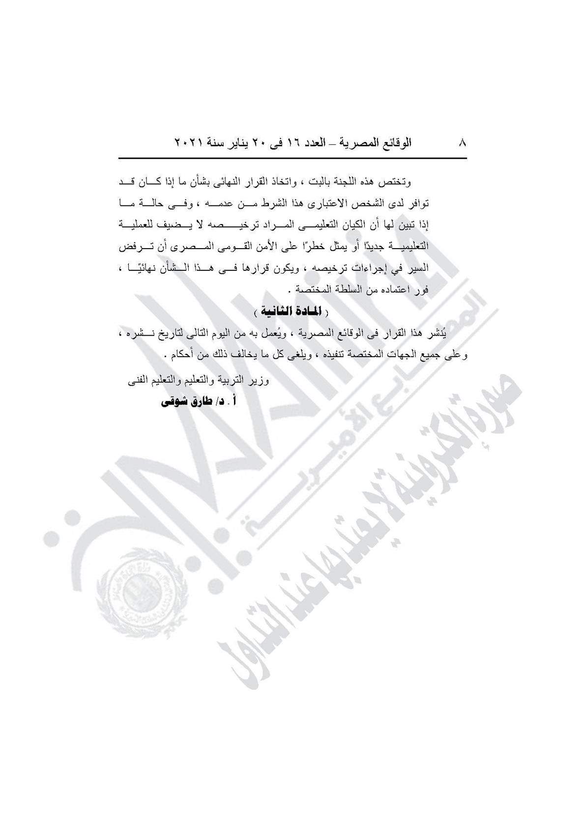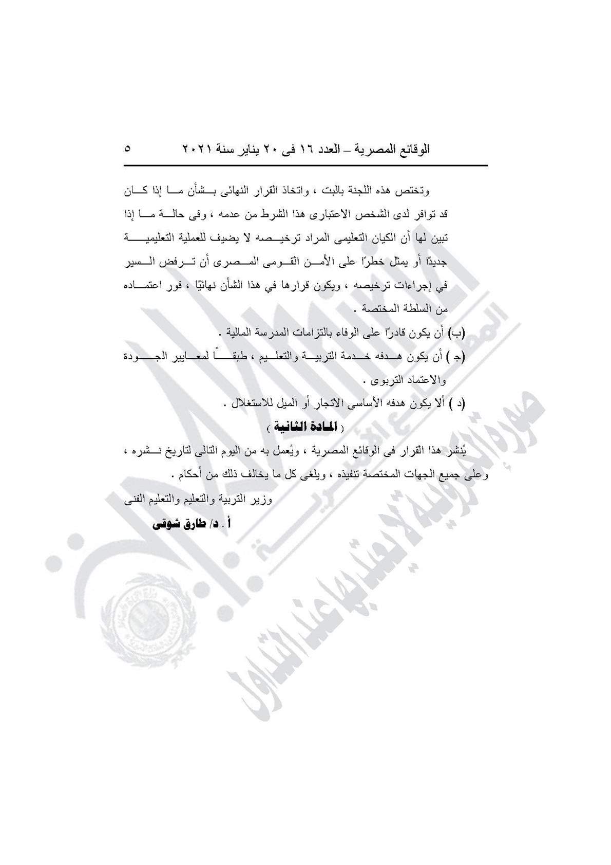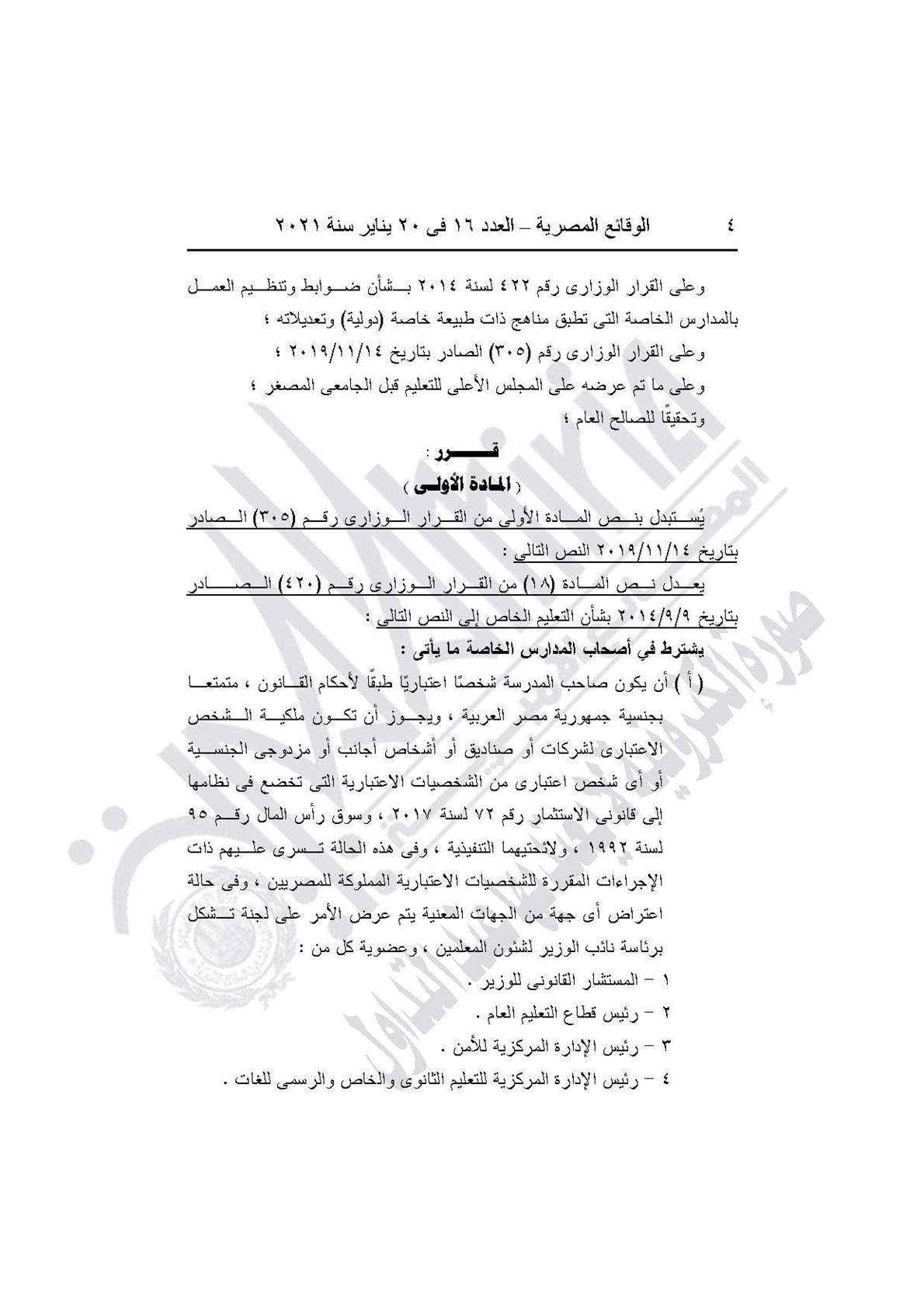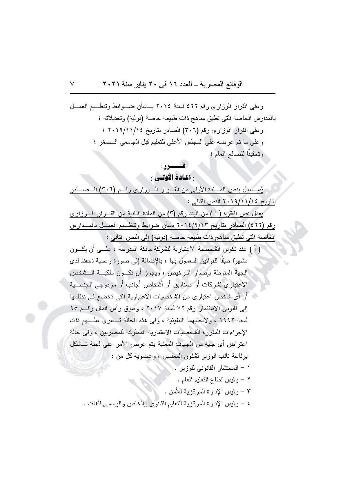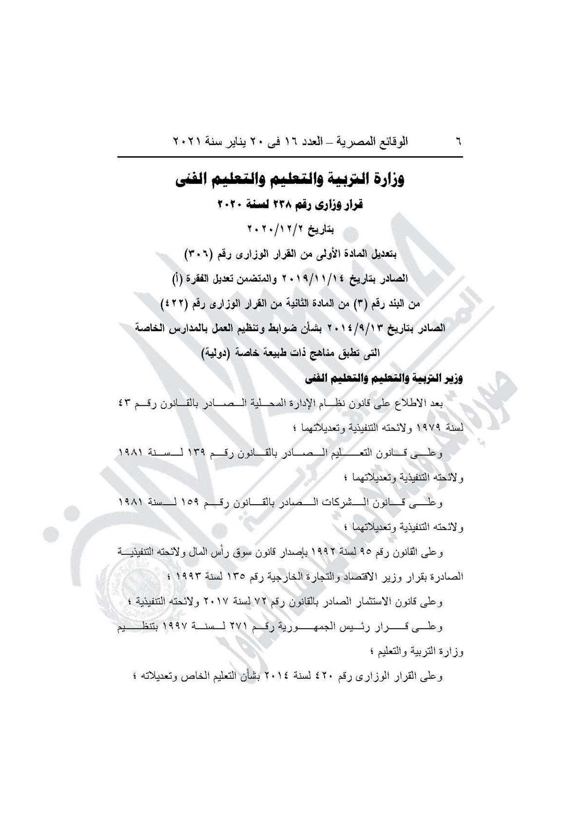 نشرت جريدة الوقائع المصرية في عددها رقم 16، الصادر في 20 يناير 2021، قراري وزارة التربية والتعليم والتعليم الفني بتحديد الاشتراطات الواجبة في أصحاب المدارس الخاصة، وضوابط وتنظيم العمل بالمدارس الخاصة التي تطبق مناهج ذات طبيعة خاصة (دولية)