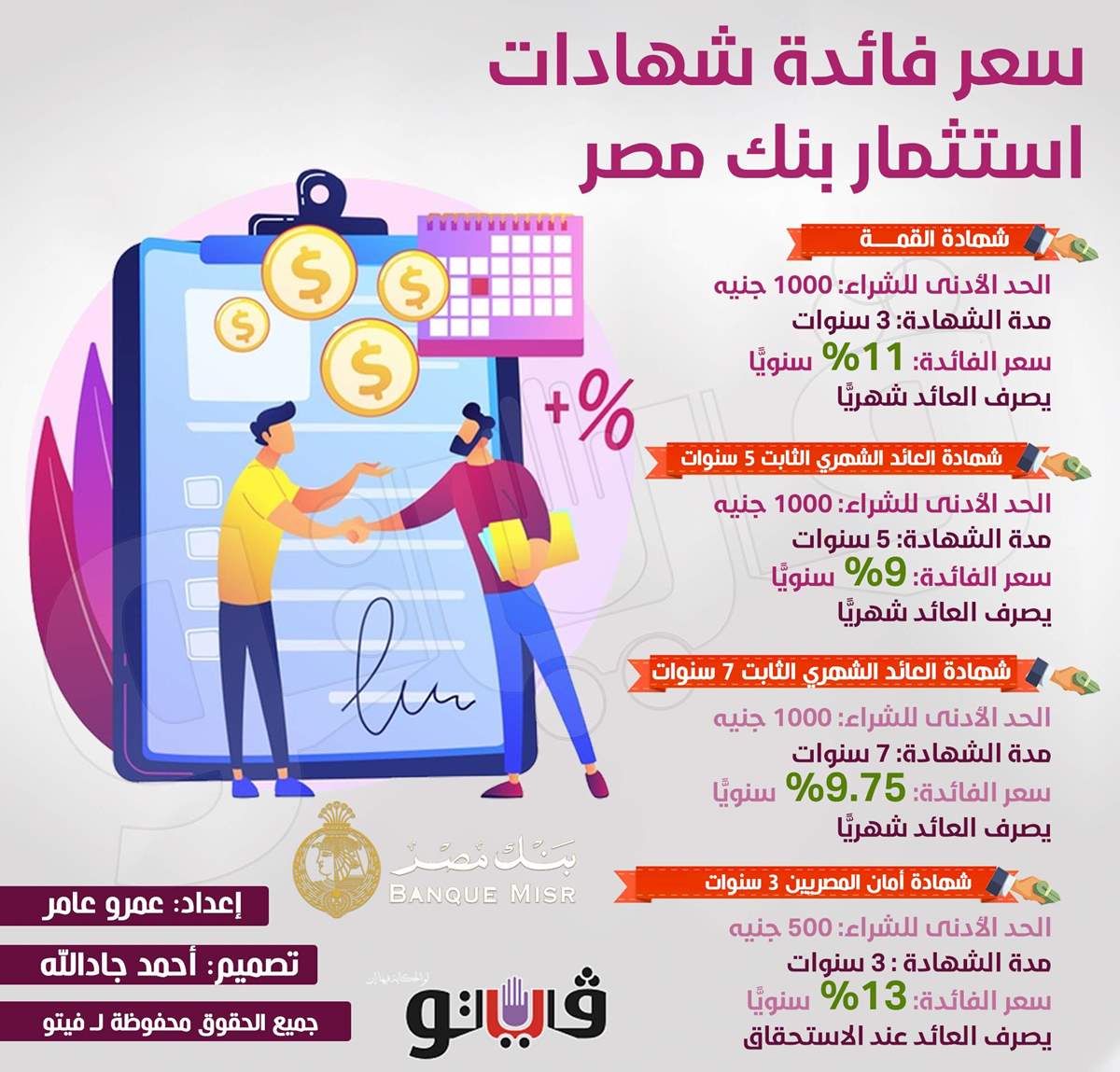 سعر فائدة شهادات استثمار بنك مصر | إنفوجراف الخميس 21/يناير/2021 - 01:40 م 1/21/2021 1:40:59 PM بنك عمرو عامر شارك طباعة 18 حجم الخط شارك طباعة شهادة القمة سعر فائدة بالجنيه المصرى
