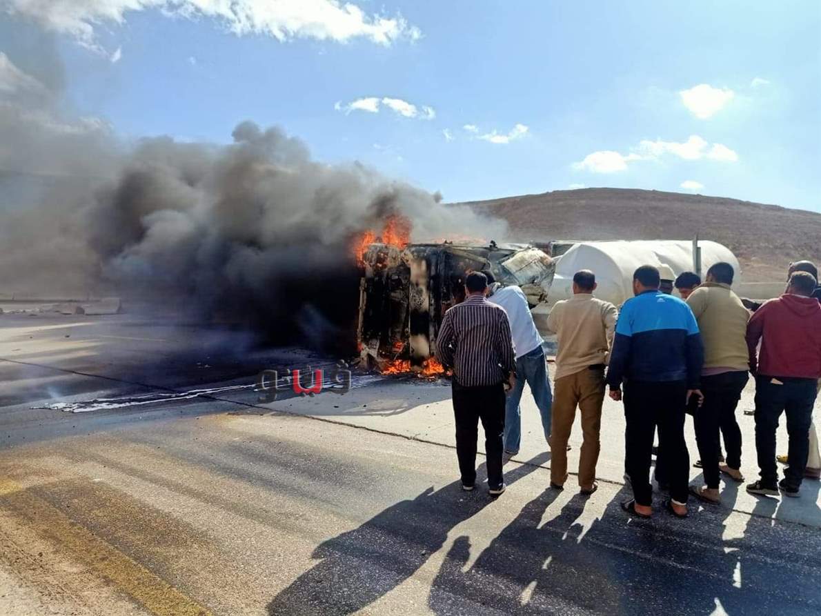وبالفحص تبين إنقلاب سيارة نقل واندلاع النيران بها ووجود إصابات وجارى السيطرة على الحريق.