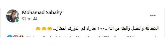 وكتب محمد الصباحي عبر حسابه الشخصي على موقع التواصل الاجتماعي فيس بوك، "الحمد لله والفضل والمنة من الله ..١٠٠ مباراه في الدورى الممتاز" .