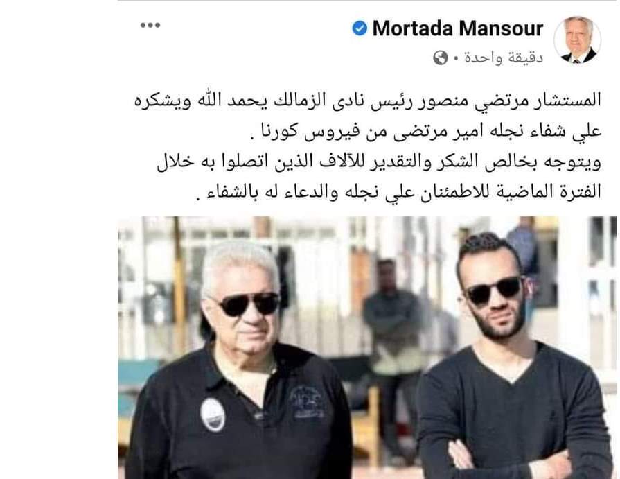 أعلن مرتضى منصور رئيس الزمالك السابق، عن شفاء نجله أمير من فيروس كورونا حيث كُتب على صفحته الرسمية على فيس بوك: "المستشار مرتضى منصور رئيس نادى الزمالك يحمد الله ويشكره على شفاء نجله أمير مرتضى من فيروس كورونا".