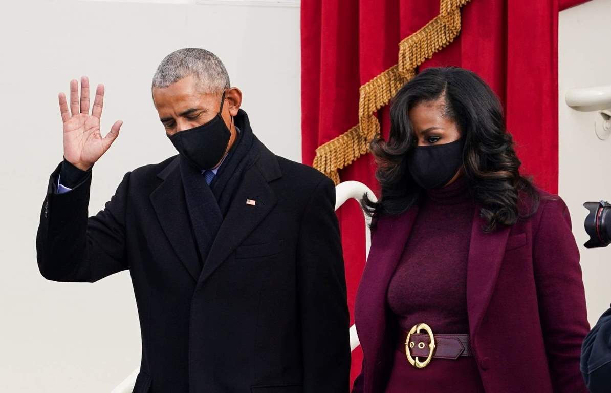 أما أوباما فارتدت زيا بلون التوت ومعطفا مع حزام ذهبي، بينما اختارت كلينتون طقما أرجوانيا ووشاحا.