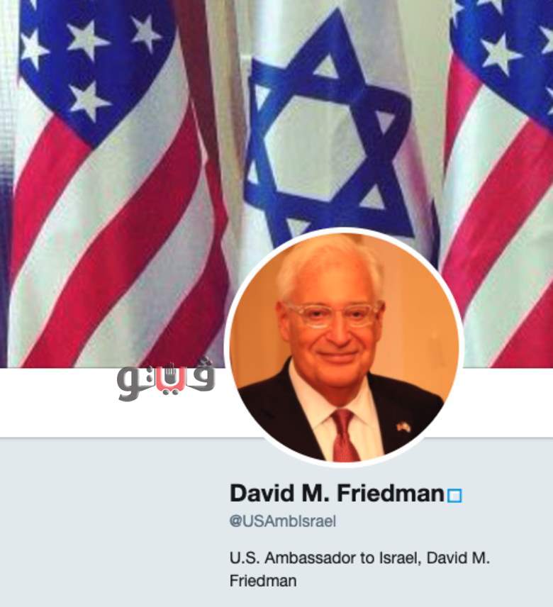 ذكرت شبكة "سي إن إن" الأمريكية، أن حساب السفير الأمريكي في إسرائيل على تويتر، غير النبذة التعريفية له ليصبح "سفير الولايات المتحدة إلى إسرائيل والضفة الغربية وقطاع غزة"، بعد وقت قصير من تولي الإدارة الأمريكية الجديدة بقيادة جو بايدن مهام عملها رسمياً.