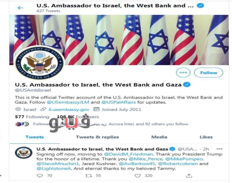 ويتبع الحساب السفارة الأمريكية، وكان يكتفي في السابق بتعريف من يتولى أمورها بأنه "سفير الولايات المتحدة إلى إسرائيل".
