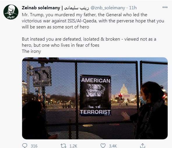 وجهت زينب سليماني، ابنة قائد فيلق القدس الإيراني الراحل قاسم سليماني، رسالة إلى الرئيس الأمريكي السابق دونالد ترامب.