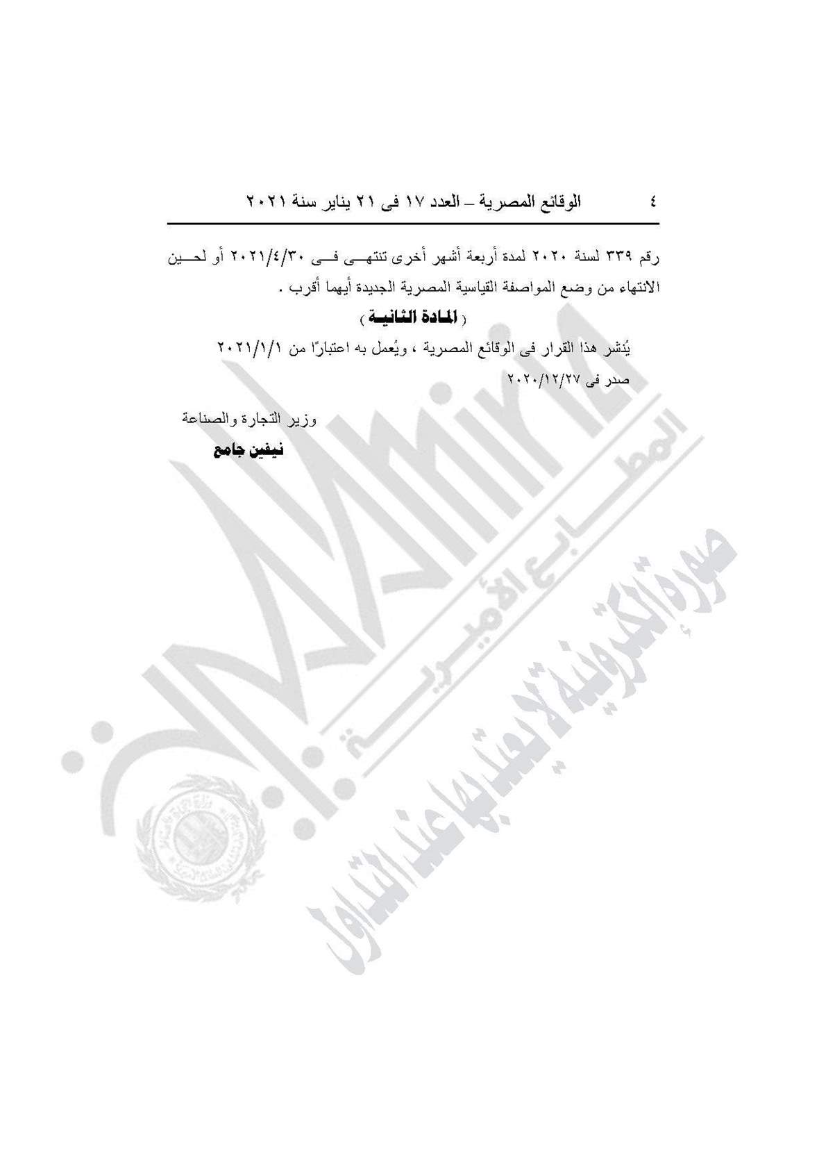 نشرت جريدة الوقائع المصرية في عددها رقم 17، الصادر في 21 يناير 2021، قرار وزارة التجارة والصناعة رقم 650 لسنة 2020، بشأن مد المهلة الممنوحة للمنتجين والمستوردين لتوفيق الأوضاع بالنسبة للمواصفة الخاصة بأجهزة إطفاء الحريق اليدوية التي تعمل بالمسحوق الكيماوي الجاف لمدة أربعة أشهر أخرى.