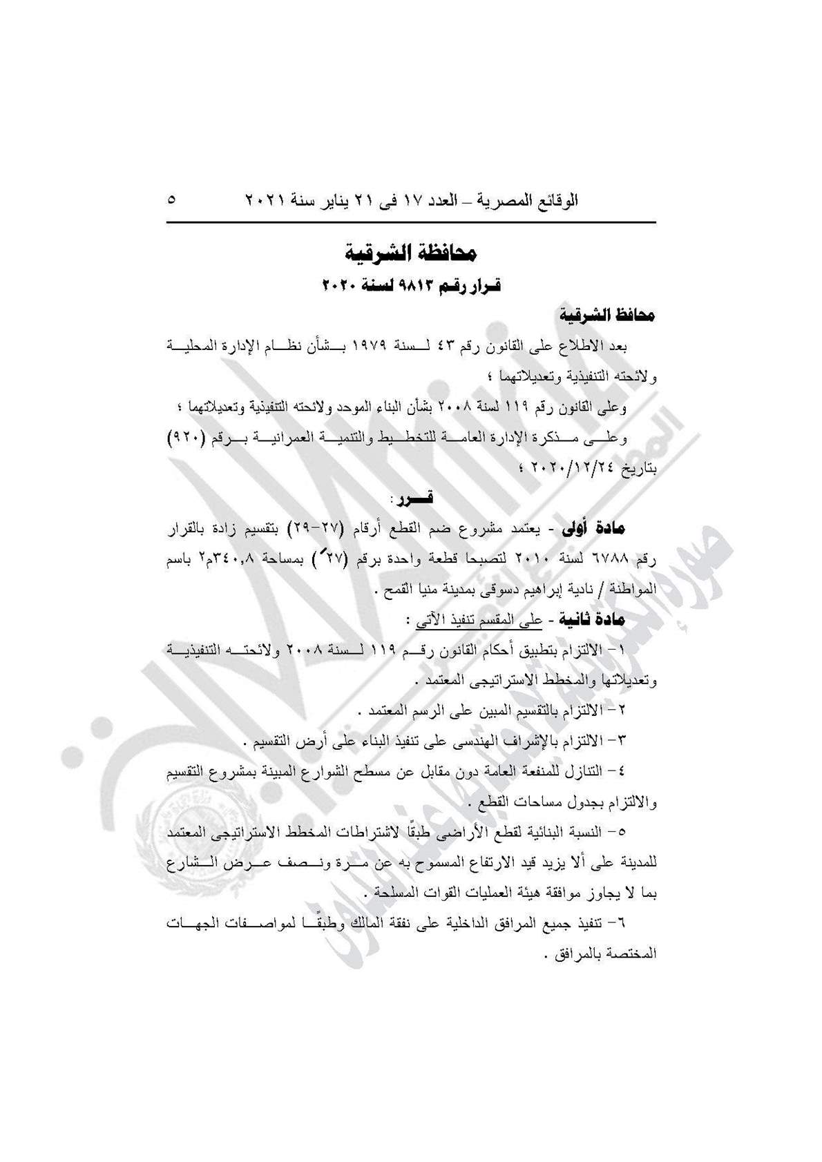 نشرت جريدة الوقائع المصرية في عددها رقم 17، الصادر في 21 يناير 2021، قرار محافظة الشرقية رقم 9813 لسنة 2020، بشأن اعتماد مشروع ضم قطع بتقسيم زادة بمدينة منيا القمح.
