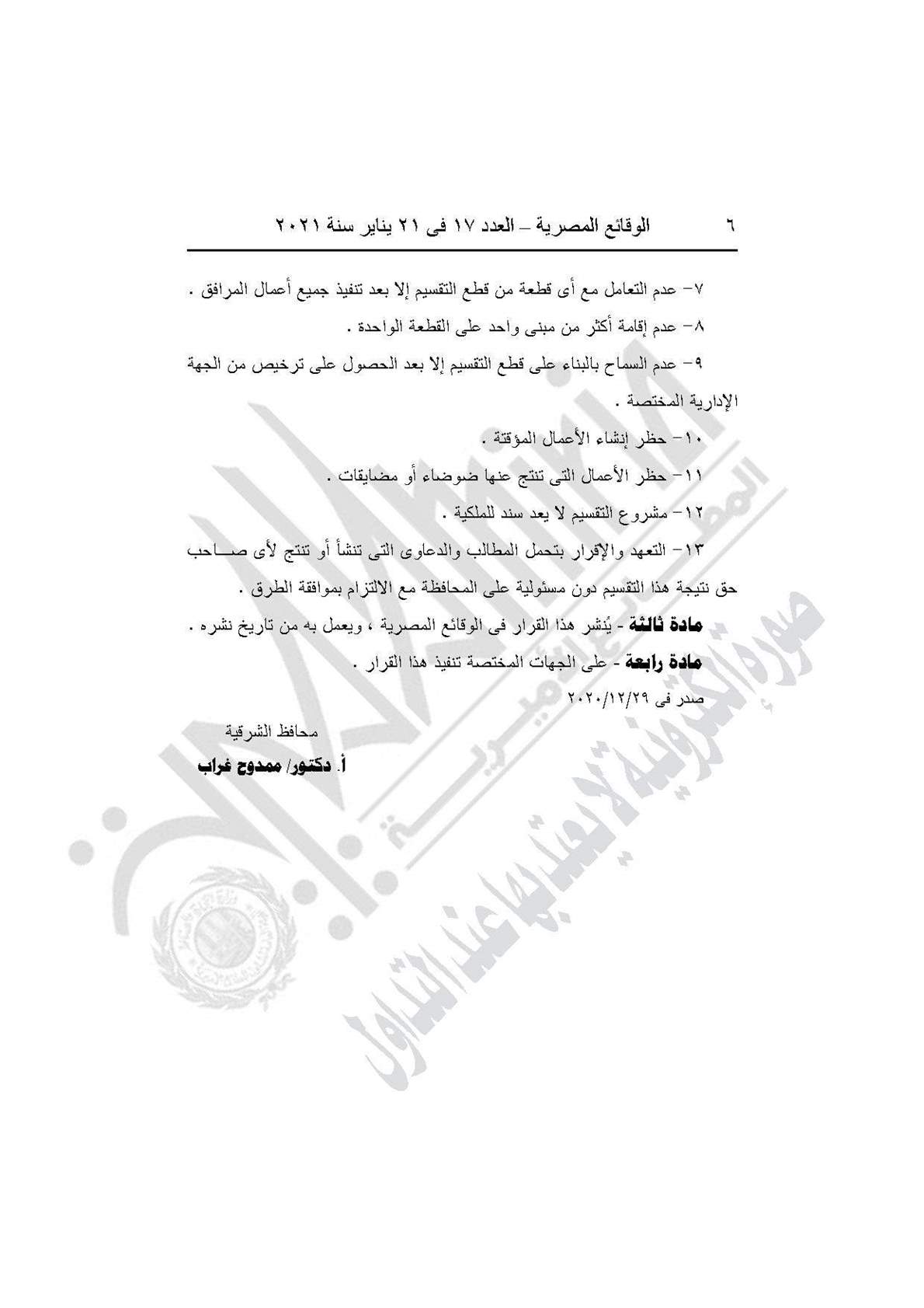 وينص القرار على اعتماد مشروع ضم القطع أرقام (27-29) بتقسيم زادة بالقرار رقم 6788 لسنة 2021 لتصبحا قطعة واحدة برقم (27) بمساحة 340.8 متر مربع باسم نادية إبراهيم دسوقى بمدينة منيا القمح.