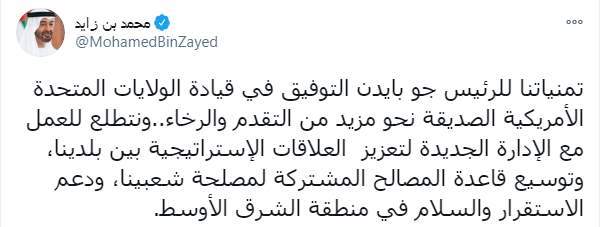 وكتب الشيخ محمد بن زايد آل نهيان تغريدة على تويتر قال فيها: "تمنياتنا للرئيس جو بايدن التوفيق في قيادة الولايات المتحدة الأمريكية الصديقة نحو مزيد من التقدم والرخاء..ونتطلع للعمل مع الإدارة الجديدة لتعزيز العلاقات الإستراتيجية بين بلدينا، وتوسيع قاعدة المصالح المشتركة لمصلحة شعبينا، ودعم الاستقرار والسلام في منطقة الشرق الأوسط."