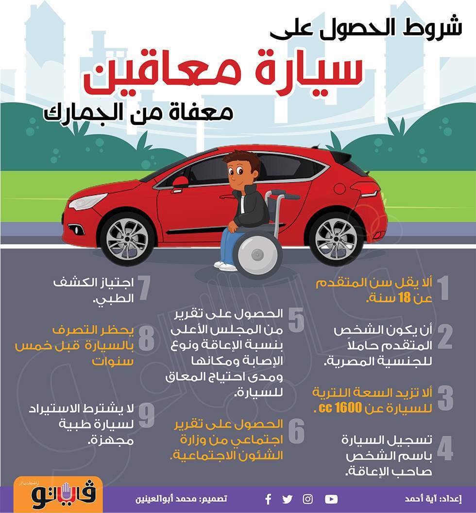 شروط الحصول على سيارة معاقين معفاة من الجمارك | انفوجراف الجمعة 22/يناير/2021 - 04:41 م 1/22/2021 4:41:05 PM سيارات آية أحمد شارك طباعة 18 حجم الخط شارك طباعة الجمارك الخدمات الكترونيا لذوي الاعاقة سيارة مجهزة سيارة مجهزة معفاة من الجمارك