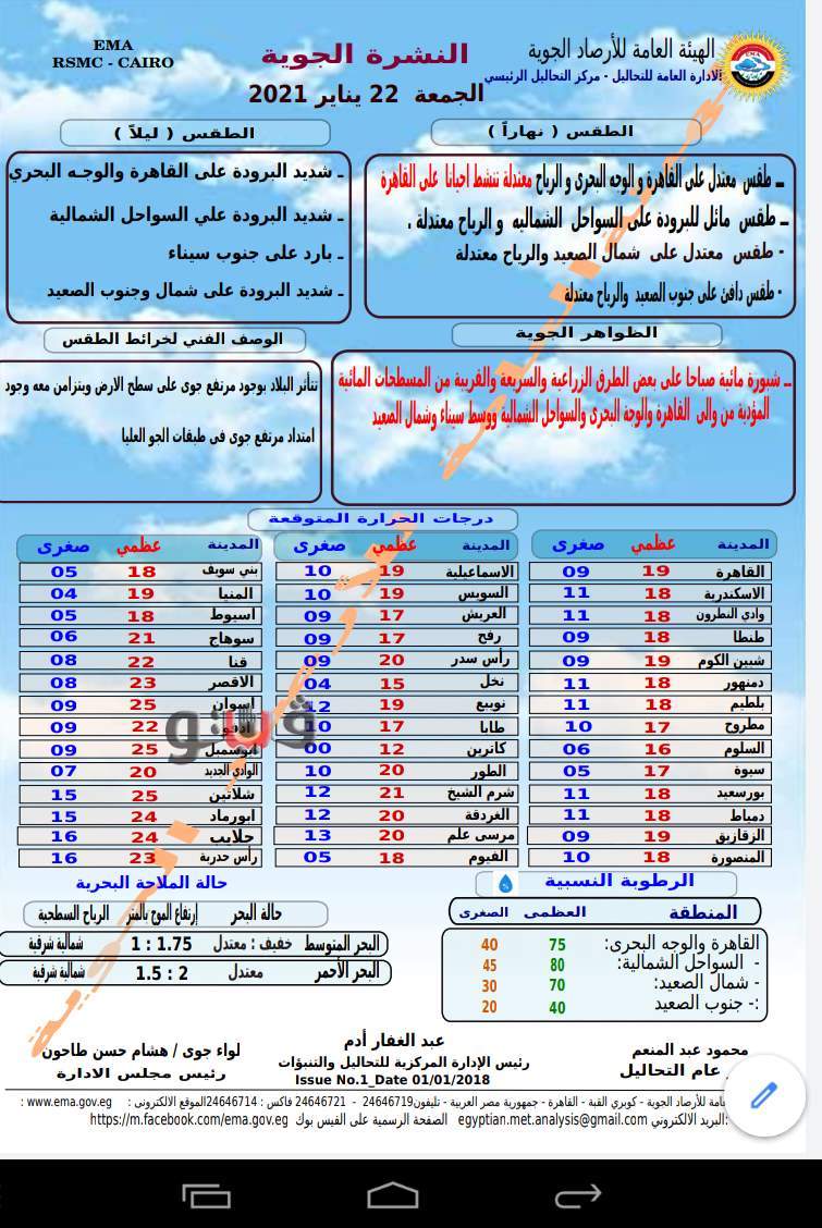 كما يسود طقس شديد البرودة ليلا، على القاهرة والوجه البحري، وعلى السواحل الشمالية، وبارد على جنوب سيناء، وشديد البرودة على جنوب سيناء وجنوب الصعيد.
