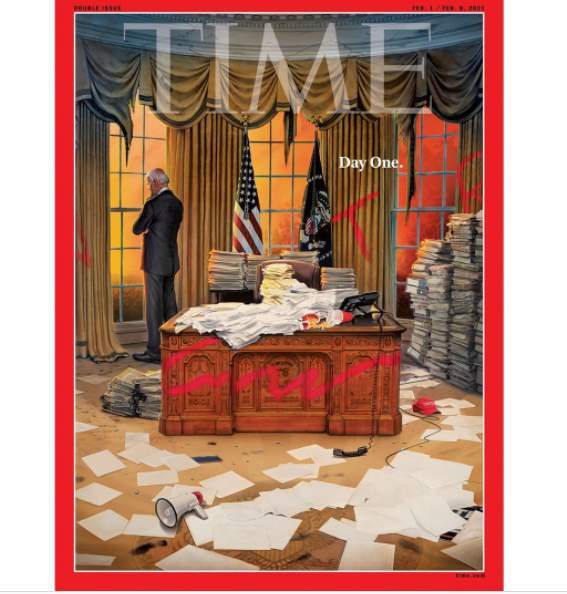 بمجرد أن سلم الرئيس الأمريكي المنتهية ولايته الحكم لنظيره المنتخب جو بايدن، حرصت مجلة "التايم" الأمريكية على نشر صورة استباقية لغلافها المقبل ترصد من خلاله الفوضى التي خلفها ترامب قبل رحيله عن المكتب البيضاوي وتركها بوجه الرئيس الجديد لمحاصرته منذ أول يوم رئاسة.