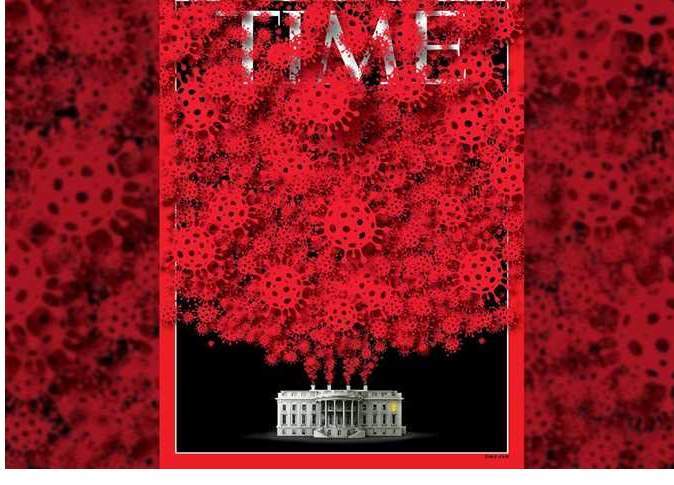وفي أكتوبر 2020، نشرت مجلة «تايم» الأمريكية أحدث غلاف لها والذي ظهر فيه بشكل واضح رمز فيروس كورونا باللون الأحمر يحتل الجزء الأكبر أعلى الغلاف، فيما ظهر البيت الأبيض صغيرا في الجزء الأسفل من الغلاف.