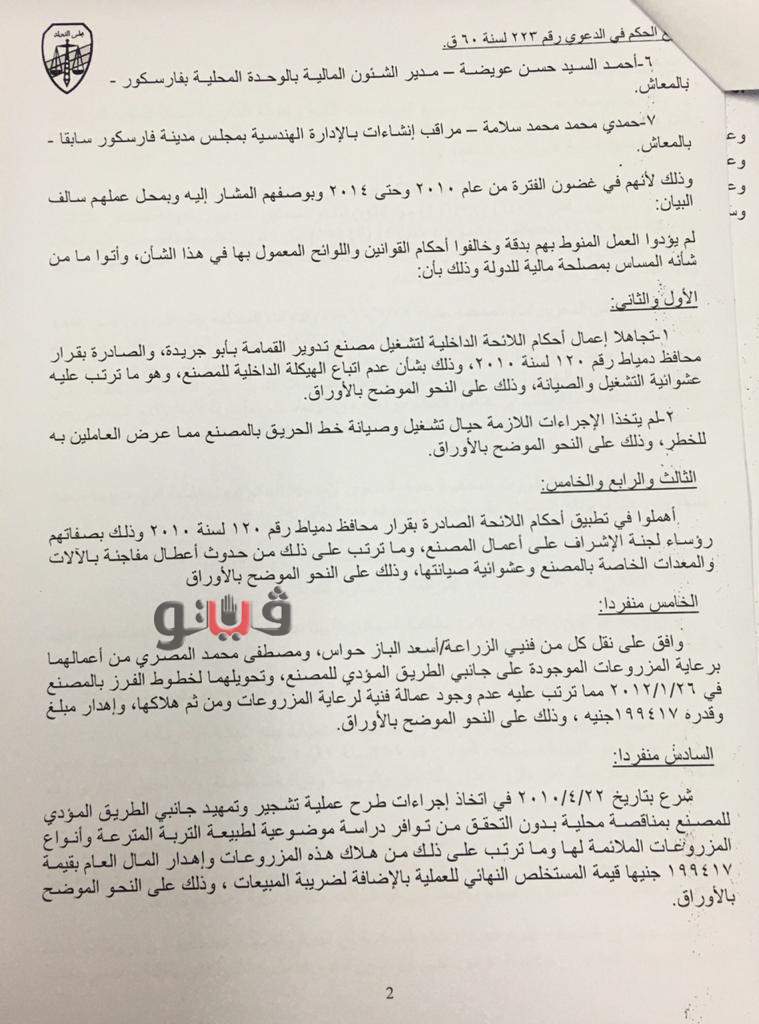 وتغريم كلًا من إلهامي السيد أحمد ومحمد عادل مصطفى وأحمد عزت مجاهد، رؤساء مركز ومدينة فارسكور السابقين بغرامة تعادل الأجر الوظيفي الذي كان يتقاضاه كل منهم في الشهر عند انتهاء خدمته