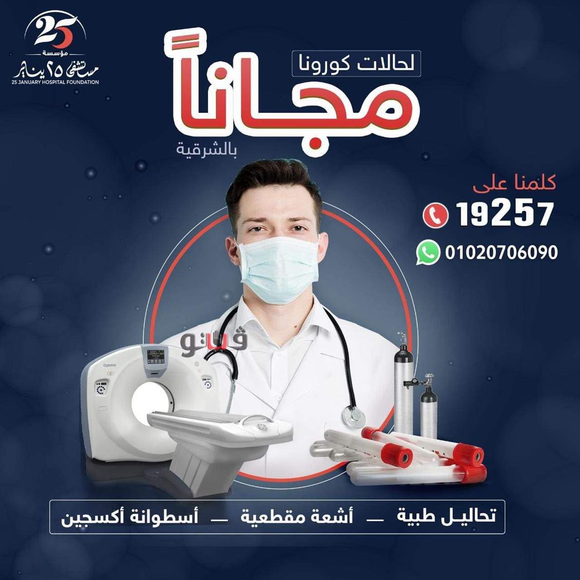 مستشفى 25 يناير تعلن عن إجراء تحاليل طبية وأشعة مقطعية وتوفير أسطوانات أكسجين مجانا