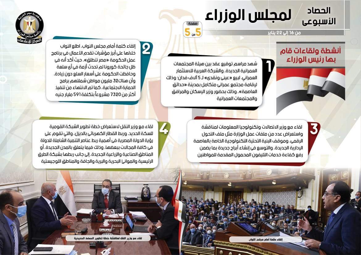 نشر المركز الإعلامي لمجلس الوزراء، تقريراً شمل إنفوجرافات سلط من خلالها الضوء على الحصاد الأسبوعي لمجلس الوزراء، وذلك خلال الفترة من 16 يناير إلى 22 يناير، والذي تضمن الموافقة على عدد من القرارات، فضلاً عن الاجتماعات واللقاءات التي عقدها الدكتور مصطفى مدبولي، رئيس مجلس الوزراء، بالإضافة إلى ما قام به من أنشطة.