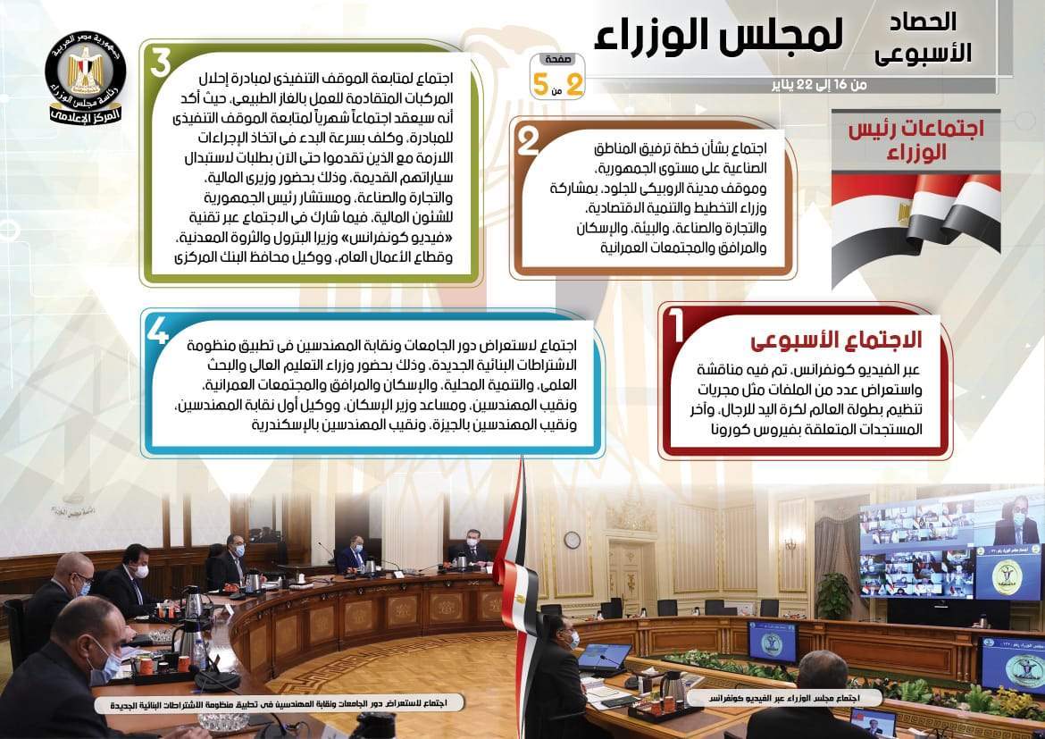وترأس الدكتور مصطفى مدبولي الاجتماع الأسبوعي عبر الفيديو كونفرانس، تم فيه مناقشة واستعراض عدد من الملفات مثل مجريات تنظيم بطولة العالم لكرة اليد للرجال، وآخر المستجدات المتعلقة بفيروس كورونا، وكذلك اجتماع لاستعراض دور الجامعات ونقابة المهندسين في تطبيق منظومة الاشتراطات البنائية الجديدة، وذلك بحضور وزراء التعليم العالي والبحث العلمي، والتنمية المحلية، والإسكان والمرافق والمجتمعات العمرانية، ونقيب المهندسين، ومساعد وزير الإسكان، ووكيل أول نقابة المهندسين، ونقيب المهندسين بالجيزة، ونقيب المهندسين بالإسكندرية، بجانب اجتماع مع وزير السياحة والآثار لمتابعة ملفات عمل الوزارة مثل عدد المنشآت الفندقية والسياحية الحاصلة على شهادة السلامة الصحية منذ بدء جائحة "كورونا"، وعدد السائحين الوافدين إلى مصر منذ استئناف حركة السياحة.
